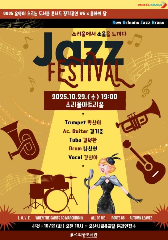 【뉴스라이트 = 조용은 기자】 경기도 오산시는 오는 10월 29일 오후 7시, 소리울도서관 3층 소리울아트리움에서 '2025 음악이 흐르는 도서관 콘서트 정기공연 #6 × 문화의 달 – Jazz Festival; 소리울에서 소울을 느끼다'를 개최한다고 밝혔다.