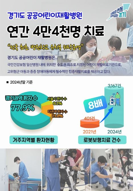 국민건강보험 일산병원 내에 마련된 경기도 공공어린이재활병원은 수도권 최초로 지정된 어린이 재활의료기관으로, 고위험군 아동과 중증 장애아동에게 필수적인 집중재활치료를 제공하고 있다. 특히 지역사회 기반 어린이 재활의료체계를 구축해, 아동과 가족이 거주지에서 단절 없는 재활치료를 받을 수 있는 기반을 마련했다.
