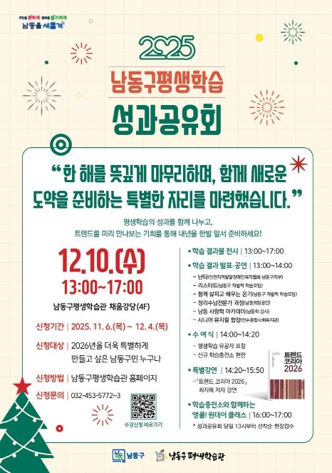 이번 성과공유회는 12월 10일 오후 1시부터 5시까지 남동구 평생학습관 채움강당에서 개최되며, 수강신청은 11월 6일부터 12월 4일까지 평생학습관 홈페이지를 통해 선착순으로 진행된다.