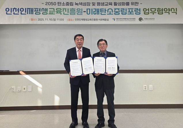 【뉴스라이트 = 이세현 기자】 2025년 11월 10일, 인천인재평생교육진흥원과 미래탄소중립포럼이 탄소중립 시민교육과 평생교육 활성화를 위한 업무협약(MOU)을 체결했다.