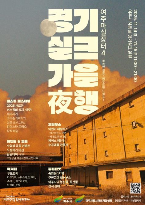 【뉴스라이트 = 김정민 기자】 여주시는 오는 11월 14일부터 15일까지 이틀간 여주 경기실크 일원(여주시 하동 123-6번지)에서 '여주마실장터4 가을야행'을 개최한다고 밝혔다. 이번 행사는 '2025 새로운 버스킹의 성지, 여주!'라는 슬로건 아래, 깊어가는 가을밤의 정취를 더할 버스킹 페스티벌과 함께 다채로운 마켓과 체험을 선보일 예정이다.