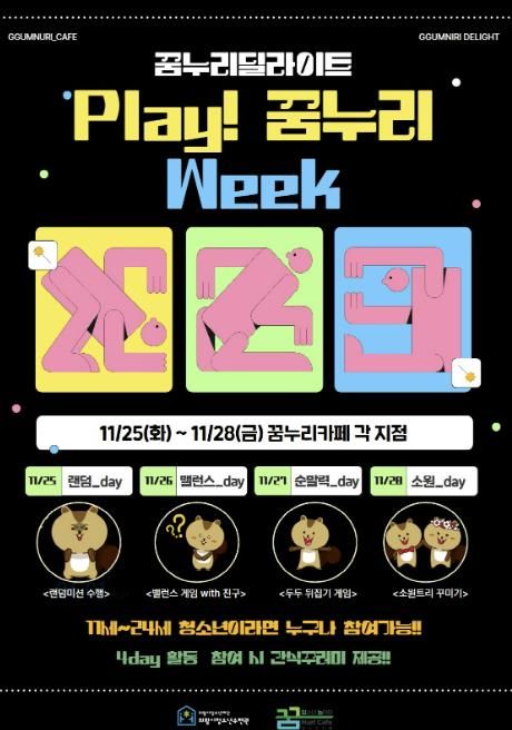 【뉴스라이트 = 이양지 기자】 의왕시청소년재단 산하 의왕시청소년수련관 꿈누리카페(▲고천점( 문화공원로 33), ▲내손점(복지로 109), ▲오전점(찬우물길 11), ▲백운밸리점(백운중앙로 74, 총 4개 지점))는 오는 11월 25일부터 28일까지 4일간 꿈누리딜라이트 『Play! 꿈누리 Week』를 진행한다고 밝혔다.