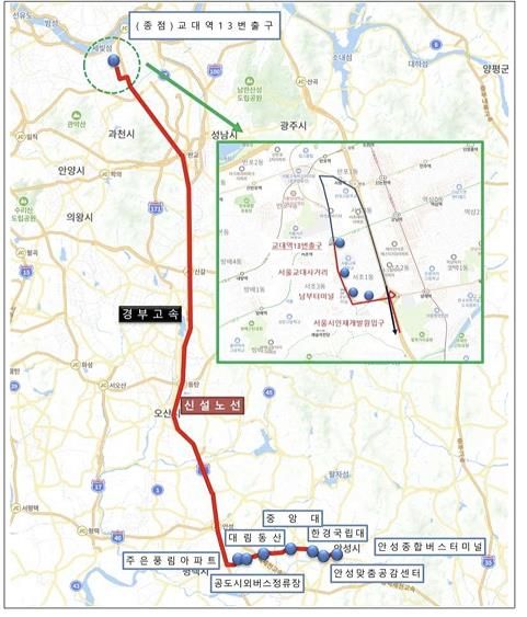 신설 광역버스는 안성종합버스터미널을 기점으로 안성맞춤공감센터, 한경국립대학교, 중앙대·롯데캐슬아파트, 대림동산, 공도시외버스정류장, 주은·풍림아파트를 거쳐 서울시인재개발원 입구, 남부터미널, 서울교대사거리, 교대역을 운행하는 노선으로, 차량 6대로 일 24회 운행하며 배차간격은 30~50분이다.