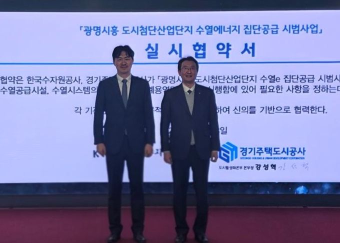 【뉴스라이트 = 조용은 기자】 경기주택도시공사(GH)는 3일 GH 수원 본사 9층 역량개발센터에서 한국수자원공사(K-water)와 함께 ‘광명시흥 도시첨단산업단지 수열에너지 집단공급 시범사업’ 추진을 위한 실시협약을 체결했다고 밝혔다. 이 자리에는 양 기관 관계자 약 30명이 참석했다.