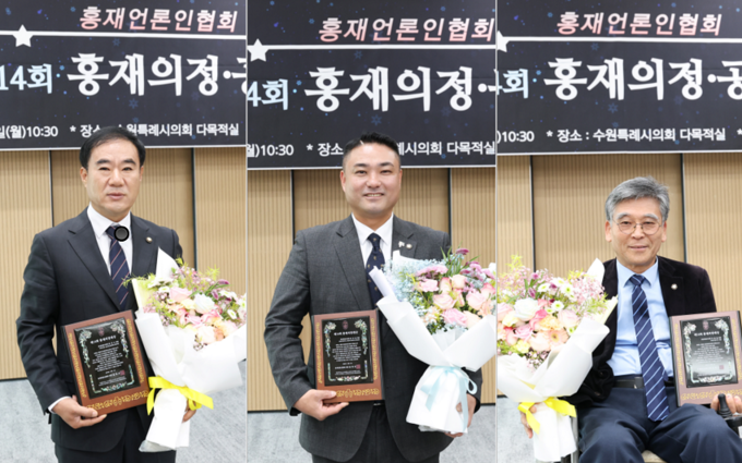 【뉴스라이트 = 조용은 기자】 화성특례시의회 소속 김상수, 김상균, 이용운 의원이 1일 수원특례시의회 신청사에서 열린 ‘제14회 홍재의정대상·공직대상 시상식’에서 홍재의정대상을 수상하는 영예를 안았다.