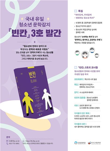 【뉴스라이트 = 이세현 기자】 인천문화재단 한국근대문학관은 국내 유일의 청소년 문학잡지 [빈칸] 3호를 발간했다.