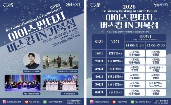 【뉴스라이트 = 이양지 기자】 시흥시는 지난 연말에 진행된 ‘2025 시흥 사운드 오브 윈터’의 열기를 잇는 후속 문화예술 프로그램으로, 겨울철 거북섬을 찾는 시민과 관광객에게 풍성한 즐길 거리를 제공하고자 ‘2026 아이스 판타지 버스킹 인 거북섬’을 운영한다.