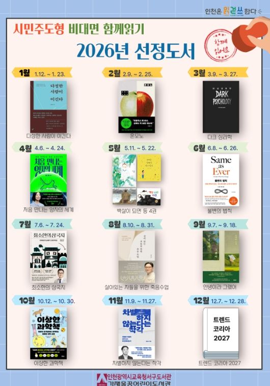 【뉴스라이트 = 이세현 기자】 인천광역시교육청서구도서관은 12월 31일 ‘2026년 시민주도형 비대면 함께읽기’ 도서 15권을 선정·발표했다.