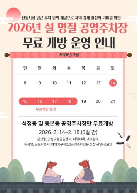 【뉴스라이트 = 박현서 기자】 안성시시설관리공단은 2026년 설 명절을 맞아 2월 14일부터 18일까지 5일간, 공단이 관리하는 공영주차장 중 전통시장 인근에 위치한 석정동 공영주차장과 동본동 공영주차장을 한시적으로 무료 개방한다고 밝혔다.