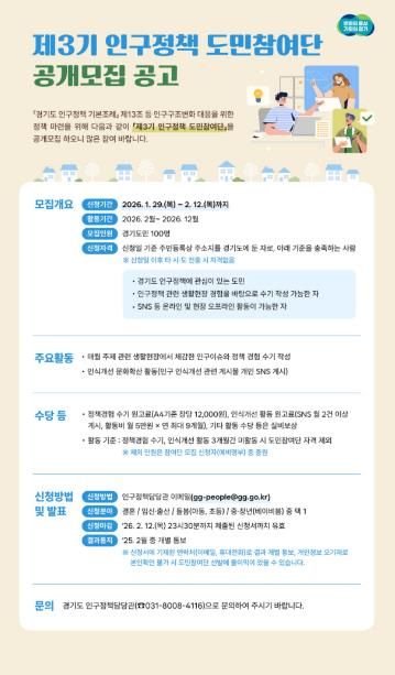 【뉴스라이트 = 조용은 기자】 경기도가 정책 대상자가 직접 정책개선에 참여하는 ‘제3기 인구정책 도민참여단’ 100명을 공개 모집한다.