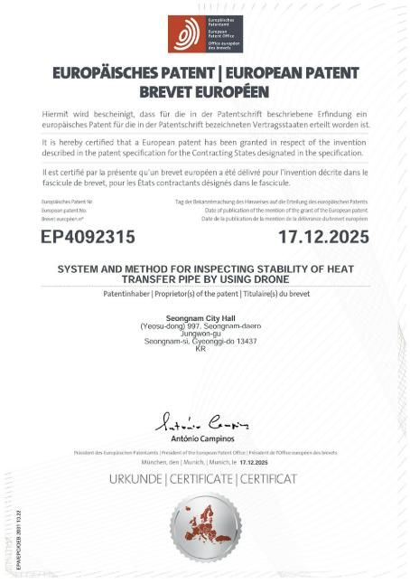 【뉴스라이트 = 김정민 기자】 성남시가 자체 개발한 ‘드론을 이용한 열수송관 안정성 검사 시스템’이 유럽특허(등록번호 EP4092315) 등록을 완료했다고 밝혔다. 이는 시 최초의 해외특허 등록 사례로, 지식재산의 해외 권리화를 통해 유럽 수출길을 여는 계기가 될 것으로 기대된다.