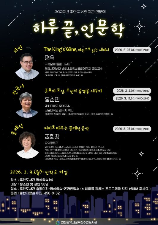 【뉴스라이트 = 이세현 기자】 인천광역시교육청주안도서관은 2월부터 3월까지 시민들이 다양한 인문학 주제를 접할 수 있는 야간 인문학 프로그램 ‘하루 끝, 인문학’을 운영한다.