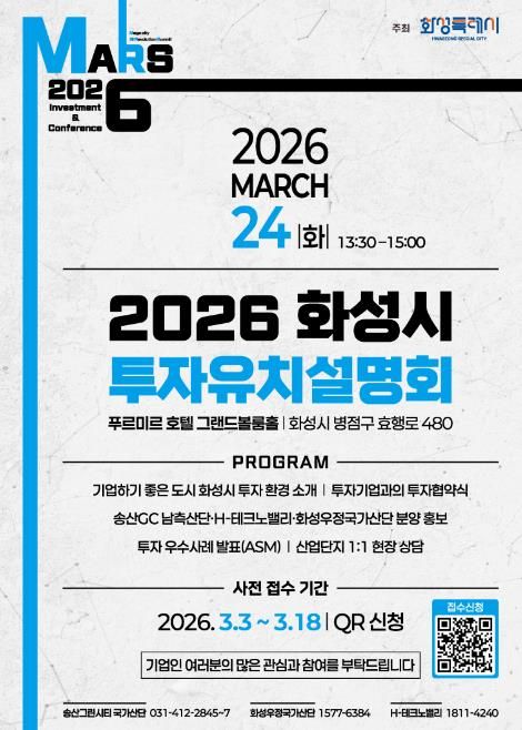 【뉴스라이트 = 조용은 기자】 화성특례시가 오는 3월 24일 푸르미르 호텔에서 ‘2026 화성특례시 투자유치 설명회’를 개최하고, 3월 3일부터 3월 18일까지 QR코드를 통한 사전접수를 진행한다.