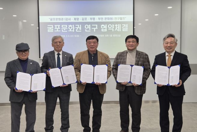 【뉴스라이트 = 이세현 기자】 부천문화원과 강서문화원, 계양문화원, 김포문화원, 부평문화원은 3월 4일 부천문화원에서 ‘굴포문화권’을 토대로 하는 연구교류 협약식을 체결했다. 이로써 ‘굴포’를 같은 문화권으로 하는 부천문화원·강서문화원·계양문화원·김포문화원·부평문화원은 학술대회와 콘텐츠 발굴 사업 등 다양한 지역학 자원을 발굴하고 활성화하기 위해 최초로 지역학 연구 모델을 구축하게 됐다. 특히, 이번 협약은 경기도(부천, 김포), 서울특별시(강서), 인천광역시(계양, 부평)를 잇는 ‘지역학’ 중심의 연구 교류를 마련한다는 점에서 주목된다.
