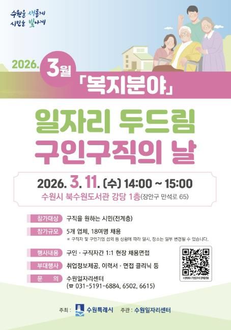 【뉴스라이트 = 조용은 기자】 수원특례시는 3월 11일 오후 2시부터 3시까지 북수원도서관 강당에서 ‘3월 일자리 두드림 구인·구직의 날’을 개최한다.
