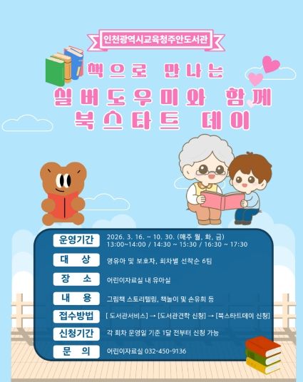 【뉴스라이트 = 이세현 기자】 인천광역시교육청주안도서관은 오는 3월 16일부터 10월 30일까지 영유아 및 보호자를 대상으로 ‘책으로 만나는 실버도우미와 함께 북스타트 데이’를 운영한다.