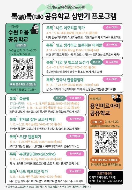 【뉴스라이트 = 한경준 기자】 경기도교육청중앙도서관이 학생들의 창의적 사고력과 진로설계 역량을 강화하기 위해 4월부터 7월까지 녪년 상반기 톡(讀)톡(talk) 공유학교’를 운영한다.