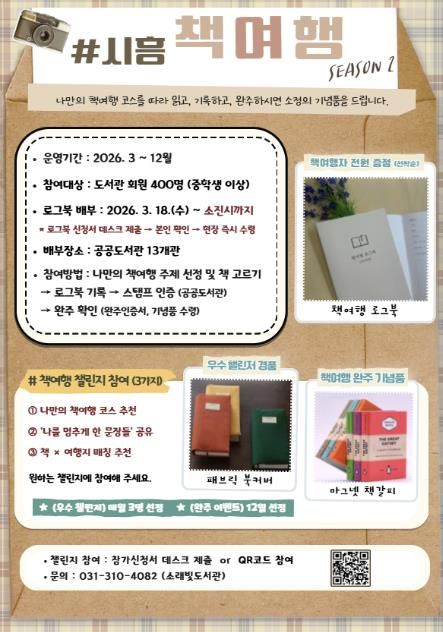 김혜순 소래빛도서관장은 “책여행은 ‘읽고, 적고, 인증하며’ 나만의 독서 여정을 완성해 가는 프로그램”이라며 “시민들이 부담 없이 참여해 책과 더 가까워지고, 기록을 통해 독서 경험을 오래 남길 수 있기를 바란다”라고 말했다.