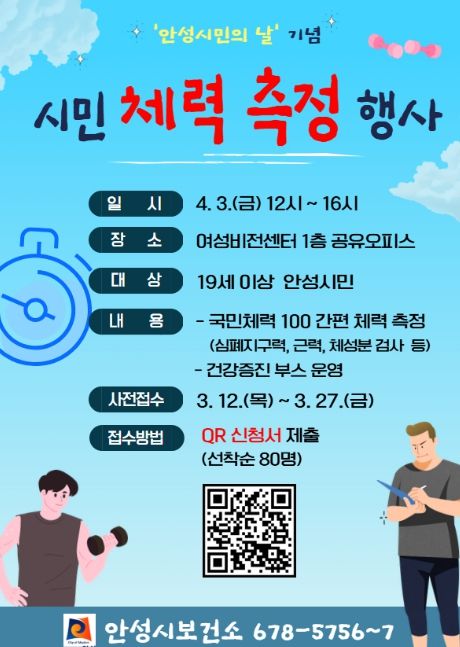 이번 행사는 오는 4월 3일 오후 12시부터 4시까지 안성시 여성비전센터 1층 공유오피스에서 진행된다. 현장에서는 체력 측정뿐만 아니라 심뇌혈관 질환 예방, 신체활동, 금연, 구강 관리 등 건강 인식 향상을 위한 다양한 건강증진 부스도 함께 운영될 예정이다.