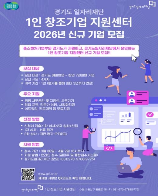 신청 대상은 공고일 기준 경기도에 주소를 둔 예비 창업자 또는 도내에 주사무소를 둔 창업 7년 이내 1인 창조기업이다. 신청은 3월 30일부터 4월 2일 오후 4시까지 잡아바 어플라이 누리집을 통해 온라인으로 접수한다. 이후 서류심사와 대면평가를 거쳐 최종 참여기업을 선정한다. 자세한 사항은 경기도일자리재단 기업지원팀으로 문의하면 된다.