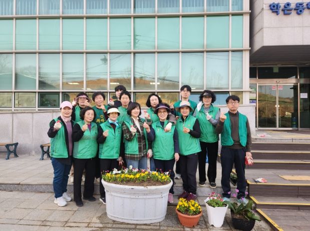 이번 행사에는 동 직원과 주민 등 30여 명이 참여해 학온동 행정복지센터 청사 앞 화단에 비올라, 팬지, 데이지 등 봄꽃 200여 본을 심었다.