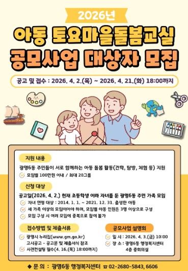 【뉴스라이트 = 이양지 기자】 광명시 광명6동 행정복지센터는 오는 21일까지 ‘2026년 아동 토요마을돌봄교실 공모사업’에 참여할 주민 가족 모임 20개 팀을 모집한다.
