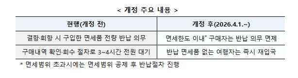 관세청은 지난 2월 말 면세품 회수 예외 근거가 「관세법 시행령」에 마련됨에 따라, 세부 이행 절차를 담은 「여행자 및 승무원 휴대품 통관에 관한 고시」 개정을 완료하고 4월 1일부터 본격 시행한다고 밝혔다.