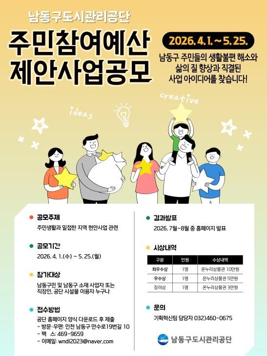 이번 공모는 오는 4월 1일부터 5월 25일까지 진행되며, 남동구민을 비롯해 남동구 소재 사업자 및 직장인, 공단 시설 이용자라면 누구나 참여할 수 있다.