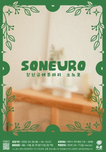 【뉴스라이트 = 김정민 기자】 여주시청년활동지원센터 푸릇은 오는 4월 청년공예동아리 'soneuro(소느로)' 참여자를 모집한다고 밝혔다.