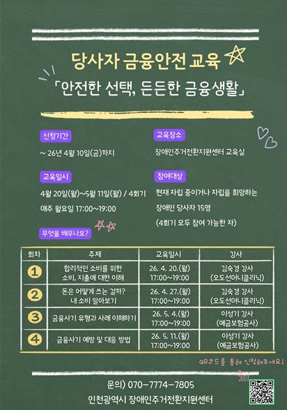 【뉴스라이트 = 이세현 기자】 인천시사회서비스원 소속 인천시장애인주거전환지원센터는 당사자 금융 안전교육 ‘안전한 선택, 든든한 금융 생활’ 참가자를 모집한다고 6일 밝혔다.