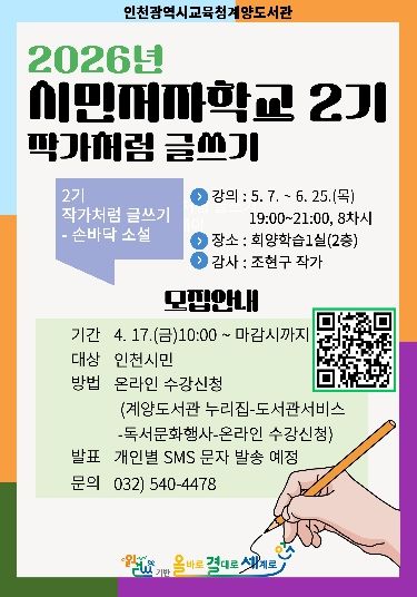 【뉴스라이트 = 이세현 기자】 인천광역시교육청계양도서관은 시민의 글쓰기 역량강화와 창작 경험 지원을 위해, 2026년 시민저자학교 2기 ‘작가처럼 글쓰기-손바닥 소설’ 프로그램을 운영한다.