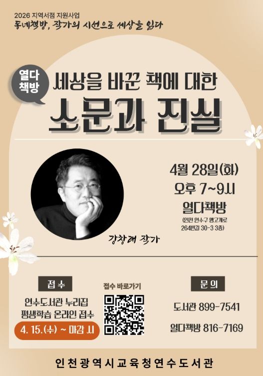 특강은 4월 28일 저녁 7시 ‘열다책방’에서 진행되며, 참여를 희망하는 인천 시민은 4월 15일부터 연수도서관 누리집에서 신청할 수 있다.