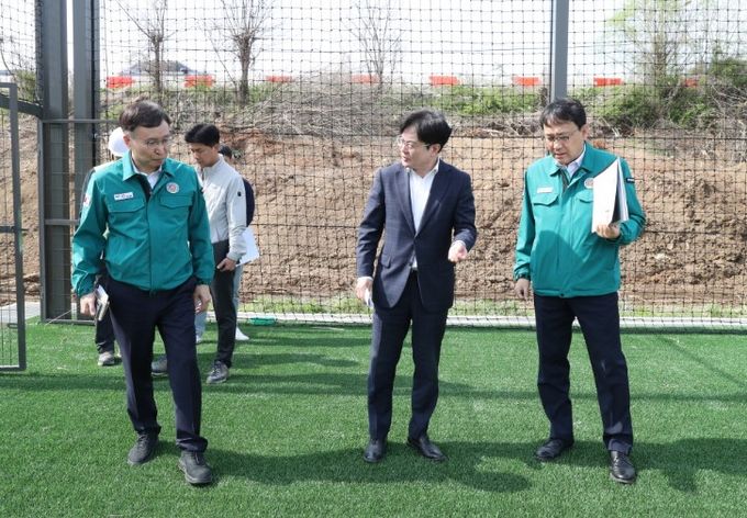 김병수 시장을 비롯해 교육문화국장, 도시주택국장 등이 함께 한 이날 현장 행정에서는 축구장 조성 현황을 확인하고 진입로 설치공사 현장을 직접 점검했다.