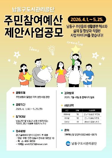 【뉴스라이트 = 이세현 기자】 인천시 남동구도시관리공단은 주민이 직접 지역 현안을 해결하고 실질적으로 체감할 수 있는 사업을 발굴하기 위해 ‘2026년도 주민참여예산제’를 본격 운영한다고 16일 밝혔다.