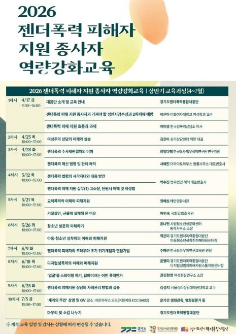 【뉴스라이트 = 조용은 기자】 경기도와 경기도젠더폭력통합대응단이 17일 도내 젠더폭력 피해 지원 현장 종사자들의 전문성 향상을 위한 ‘2026 역량강화 교육’ 상반기 과정을 시작하며 현장 대응력 강화에 나섰다.