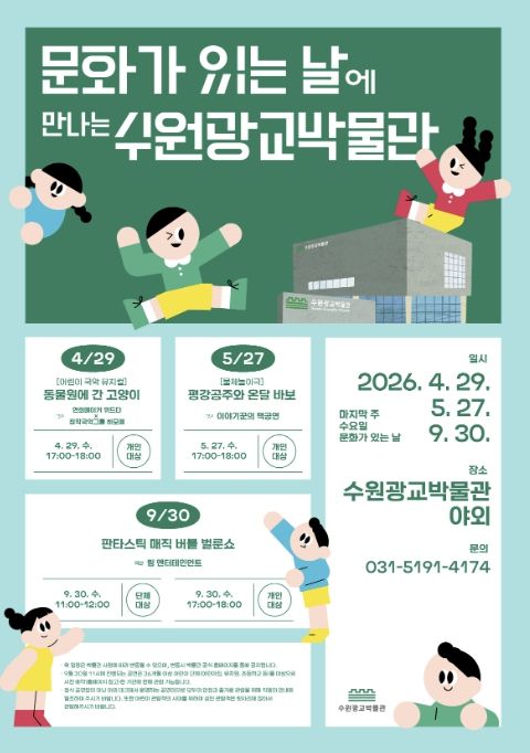 수원광교박물관 관계자는 “이번 공연은 어린이에게는 꿈과 즐거움을, 가족에게는 소중한 추억을 선사하기 위해 마련했다”며 “시민이 일상에서 문화를 누릴 수 있도록 다양한 프로그램을 지속해서 운영하겠다”고 말했다.