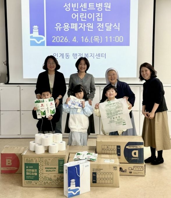 【뉴스라이트 = 조용은 기자】 수원시 팔달구 인계동은 지난 16일 오전, 성빈센트병원 어린이집으로부터 아이들이 정성껏 모은 유용 생활 폐자원을 전달받았다고 밝혔다.