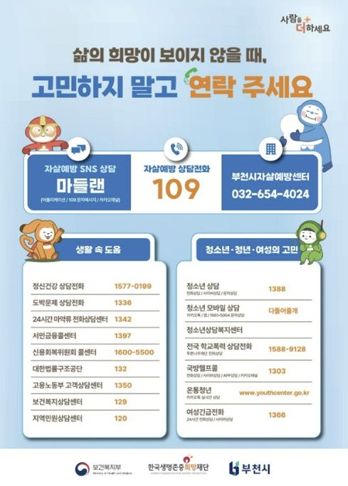 송정원 부천시보건소장은 “힘든 순간일수록 혼자 견디려 하지 말고 반드시 도움을 요청해야 한다”며 “주변의 작은 관심과 한 번의 연락이 소중한 생명을 지킬 수 있다”고 강조했다.