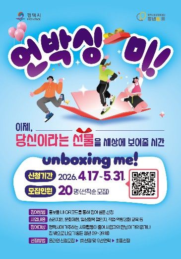 【뉴스라이트 = 박현서 기자】 평택시 청년지원센터는 4월 17일부터 5월 31일까지 평택시에 거주하는 사회활동이 줄어 사람과의 만남이 거의 없거나 집 밖으로 나오기 힘든 청년의 일상 회복과 사회 참여 촉진을 위해 실시하는 지원사업 '언박싱 미!' 참여자를 모집한다.