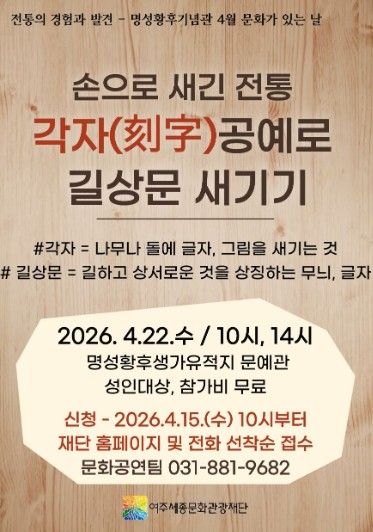 【뉴스라이트 = 김정민 기자】 여주세종문화관광재단은 오는 4월 22일, 명성황후기념관 4월 문화가 있는 날 프로그램으로 '손으로 새긴 전통, 각자(刻字)공예로 길상문 새기기'를 진행한다.