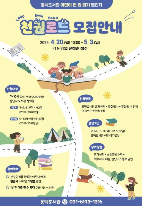 【뉴스라이트 = 박현서 기자】 용인특례시 동백도서관은 어린이 천 권 읽기 챌린지 ‘천권로드(ROAD)’ 참여자를 모집한다고 20일 밝혔다.