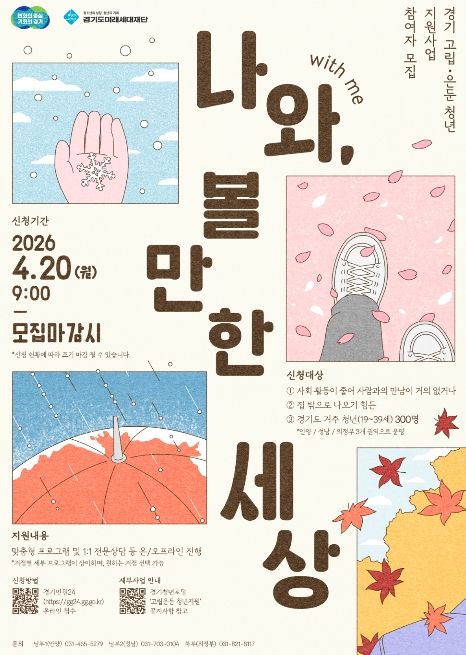 【뉴스라이트 = 조용은 기자】 경기도가 사회적 관계가 단절된 고립·은둔 청년의 일상 회복을 돕기 위해 20일부터 ‘경기 고립·은둔 청년 지원사업: 나와(with me), 볼만한 세상’ 참여자 300명을 모집한다.