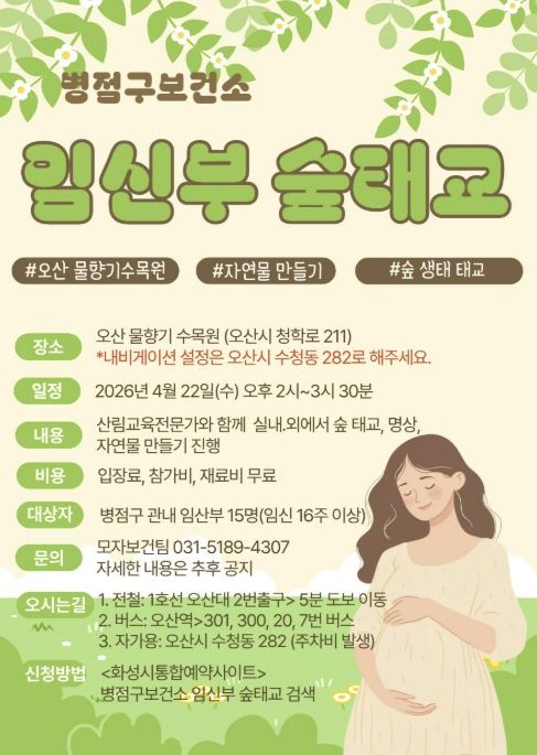 심정식 병점구보건소장은 “숲태교 프로그램은 임신부의 심리적 안정과 태아의 건강한 발달을 함께 도모할 수 있는 의미 있는 프로그램”이라며 “앞으로도 임신부와 영유아를 위한 맞춤형 건강증진 사업을 지속적으로 확대해 나가겠다”고 말했다.