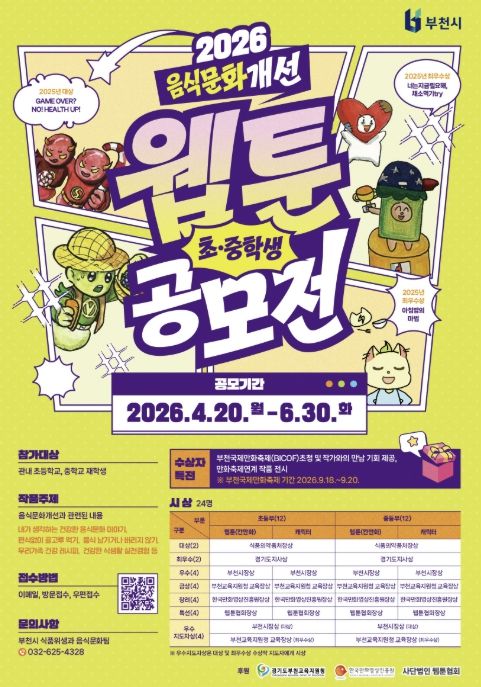 【뉴스라이트 = 이세현 기자】 부천시는 4월 20일부터 6월 30일까지 ‘2026년 음식문화개선 초중학생 웹툰·캐릭터 공모전’을 연다. 이번 공모전은 학생들이 일상 속 음식문화를 주제로 직접 창작에 참여함으로써 올바른 식문화에 대한 인식을 높이기 위해 매년 추진되고 있다.
