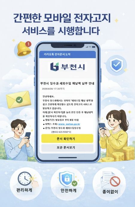【뉴스라이트 = 이세현 기자】 부천시는 이달 20일부터 시민 납세 편의를 높이고 고지서 전달의 정확성을 강화하기 위해 세외수입(일반회계) 체납안내문을 카카오톡으로 발송하는 모바일 전자고지 서비스를 시행한다.