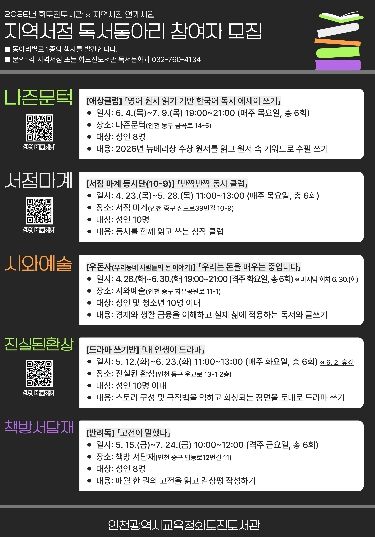 【뉴스라이트 = 이세현 기자】 인천광역시교육청화도진도서관은 지역 독서 문화 활성화를 위해 ‘지역서점 연계 독서동아리’ 참여자를 모집한다고 20일 밝혔다.