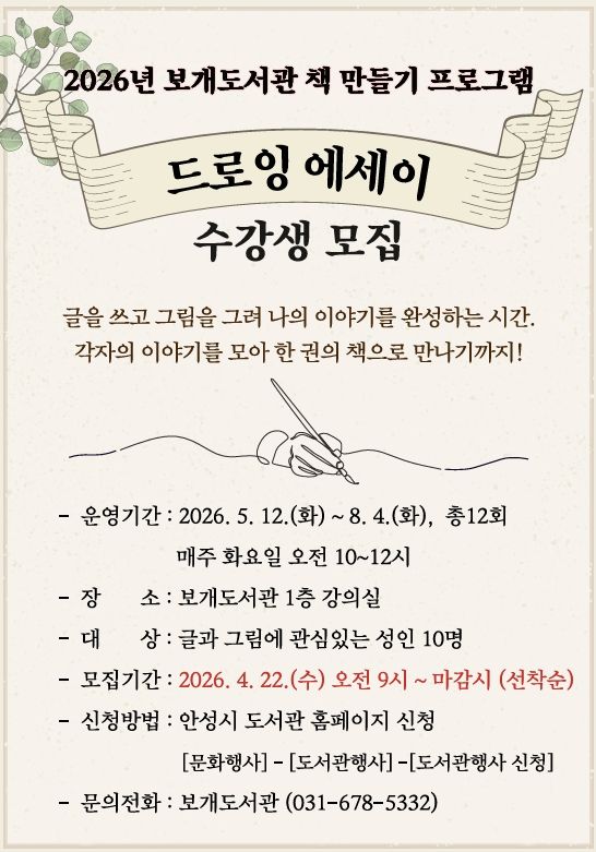 황선경(호아) 그림책 작가의 지도로 5월 12일부터 8월 4일까지 매주 화요일(총 12회) 진행된다. 수강생들은 글과 그림으로 자신의 이야기를 담은 짧은 에세이를 완성하고, 이를 모아 한 권의 책으로 제작하는 전 과정을 경험하게 된다. 정서적 위로와 창작의 기쁨을 동시에 누릴 수 있는 과정으로, 성인 10명을 선착순 모집한다. 4월 22일 수요일 오전 9시부터 안성시 도서관 홈페이지에서 신청할 수 있다.