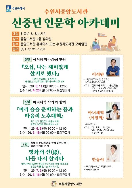 【뉴스라이트 = 조용은 기자】 수원시 중앙도서관이 5월부터 7월까지 매달 1회 운영하는 ‘신중년 인문학 아카데미’ 수강생을 모집한다.