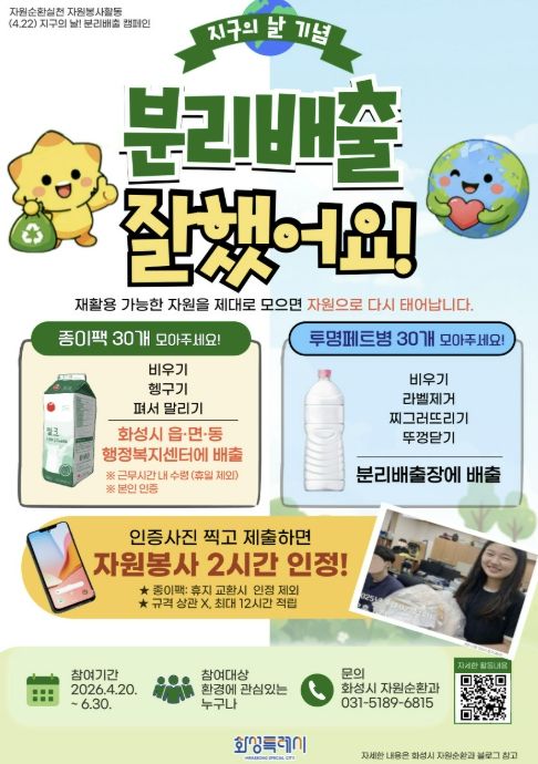 【뉴스라이트 = 조용은 기자】 화성특례시가 2026년 ‘지구의 날(4월 22일)’을 맞아 시민들이 일상 속에서 환경 보호를 실천할 수 있는 자원봉사 활동 '분리배출 잘했어요' 캠페인을 운영한다고 밝혔다.