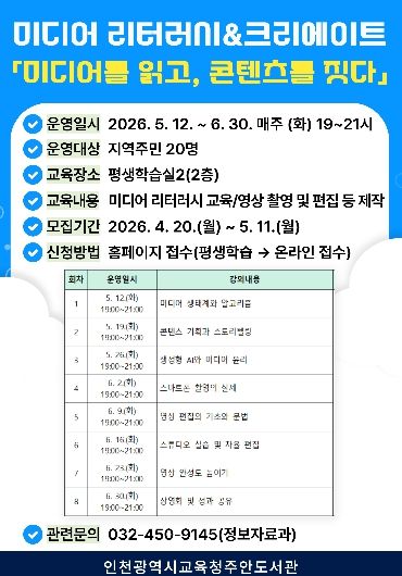 【뉴스라이트 = 이세현 기자】 인천광역시교육청주안도서관은 시민의 디지털 역량 강화와 올바른 미디어 활용을 돕기 위해, 5월 12일부터 미디어 리터러시 교육 프로그램 ‘미디어를 읽고, 콘텐츠를 짓다’를 운영한다.
